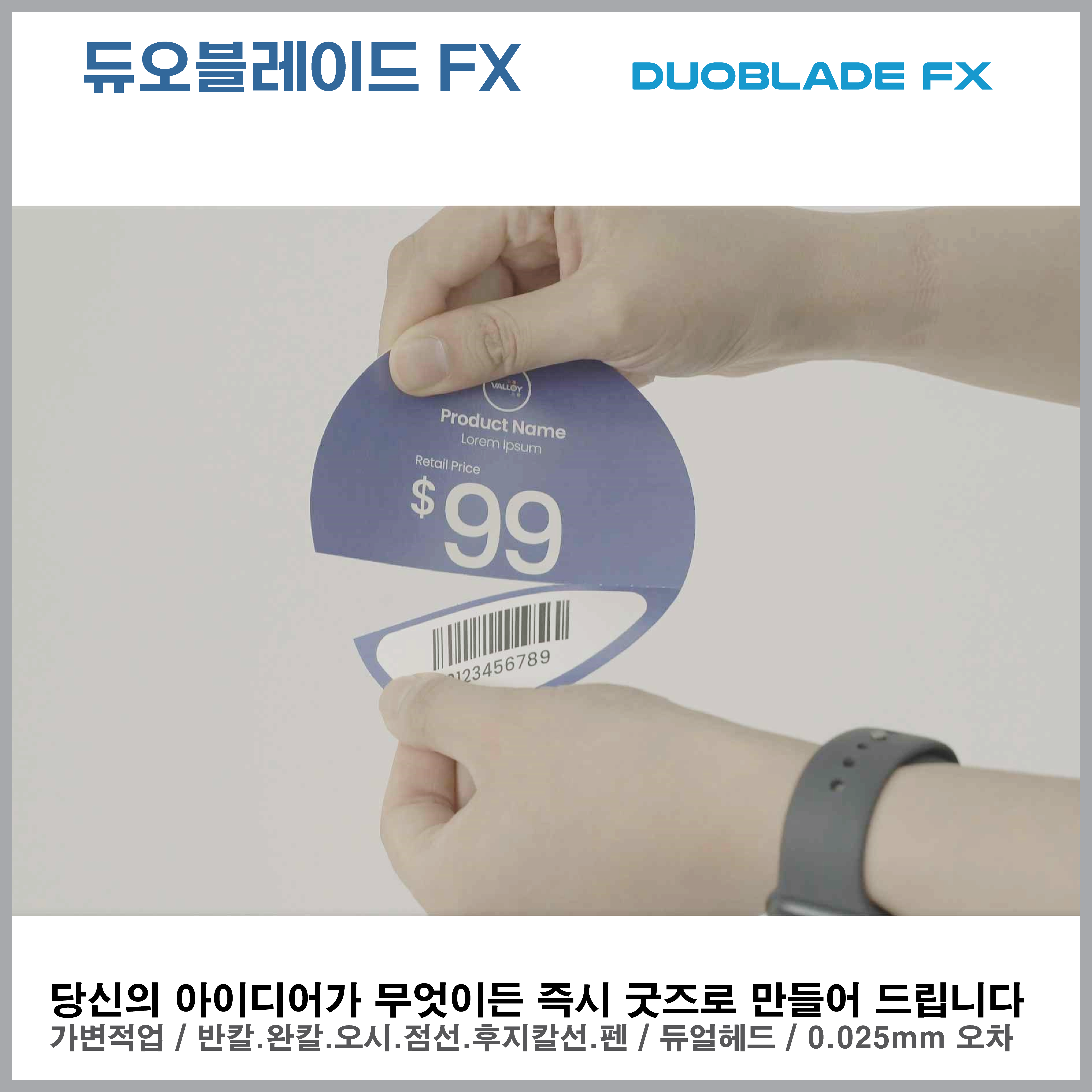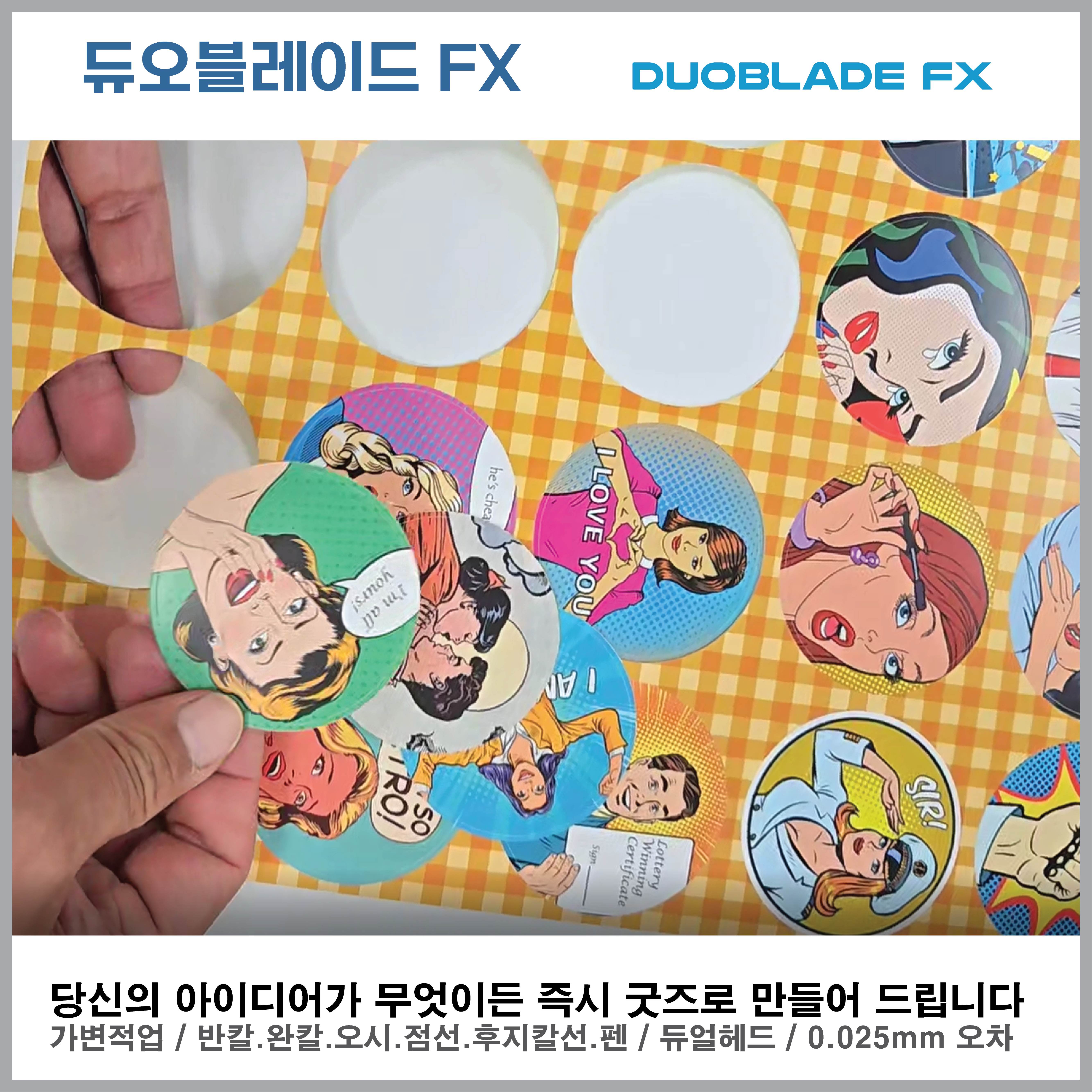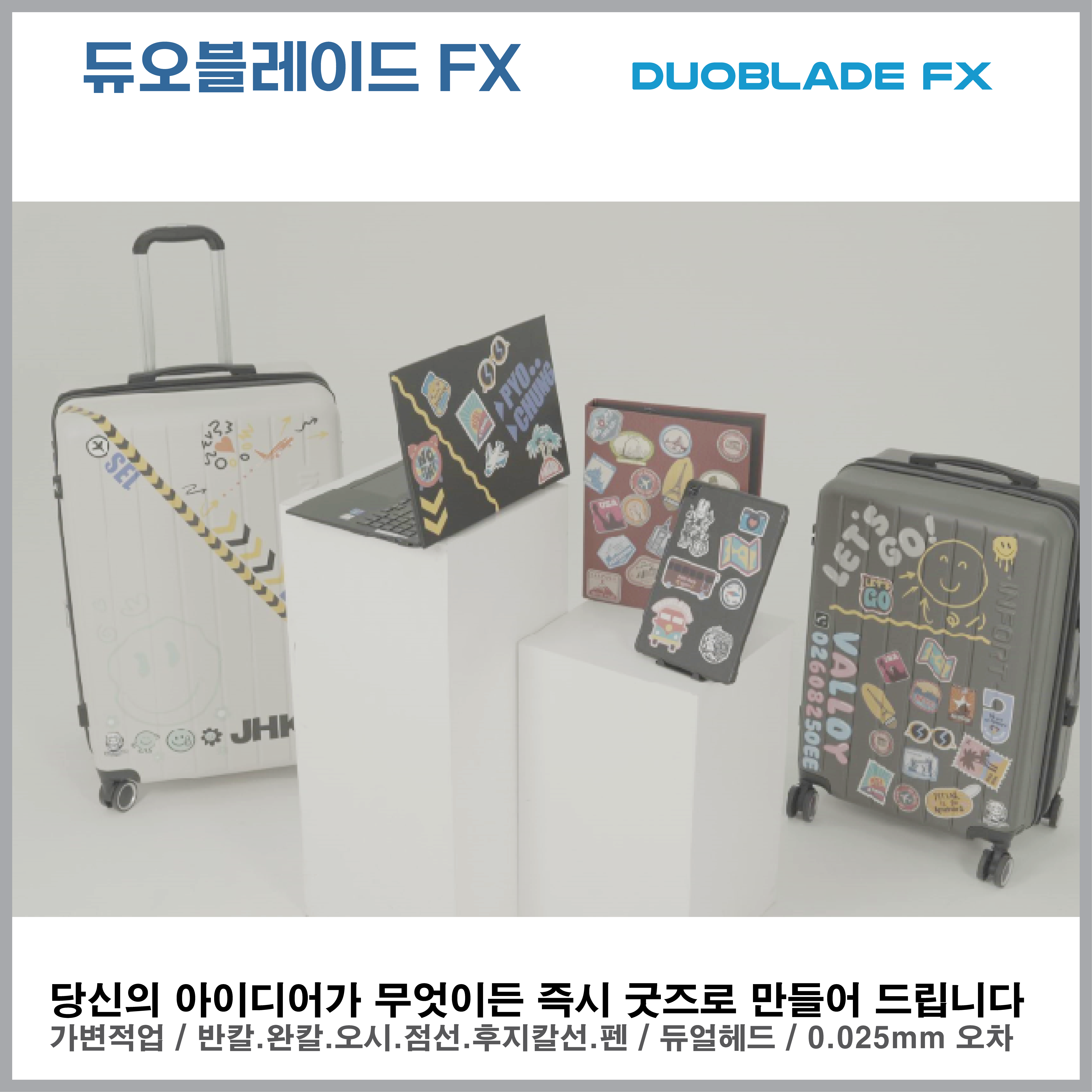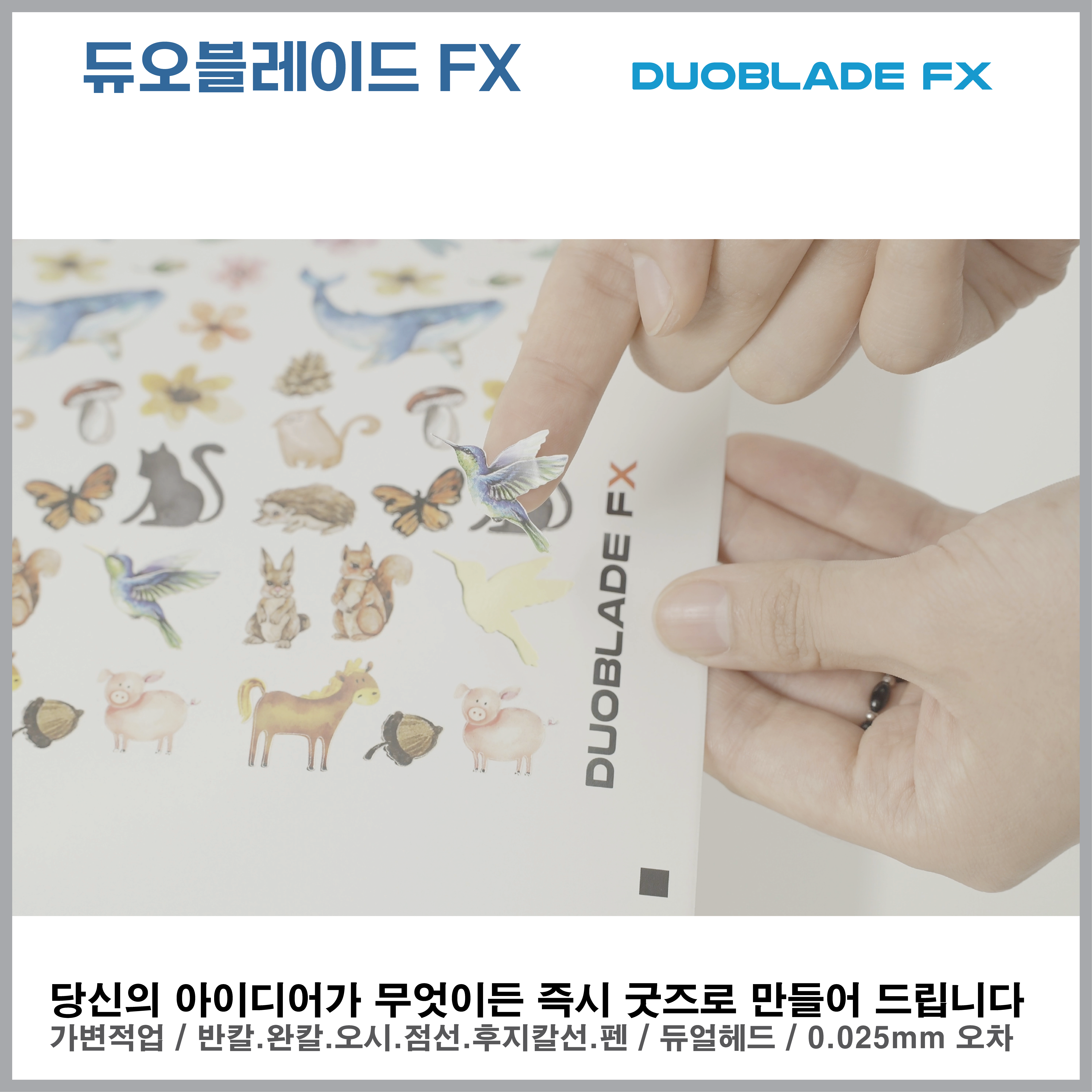 당신의 상상력은 현실이 됩니다. 다이어리, 케리어, 노트북 스티커, 복잡하고 아름다운 카드나 태그, 오시선과 절취선이 있는 박스, 케이크나 여행용 토퍼는 물론 세밀한 네일 스티커까지… 중소기업 혁신기술로 인정받고 서울어워드를 수상한 듀오블레이드 FX, 당신의 굿즈 생산에 날개를 달아 드립니다.