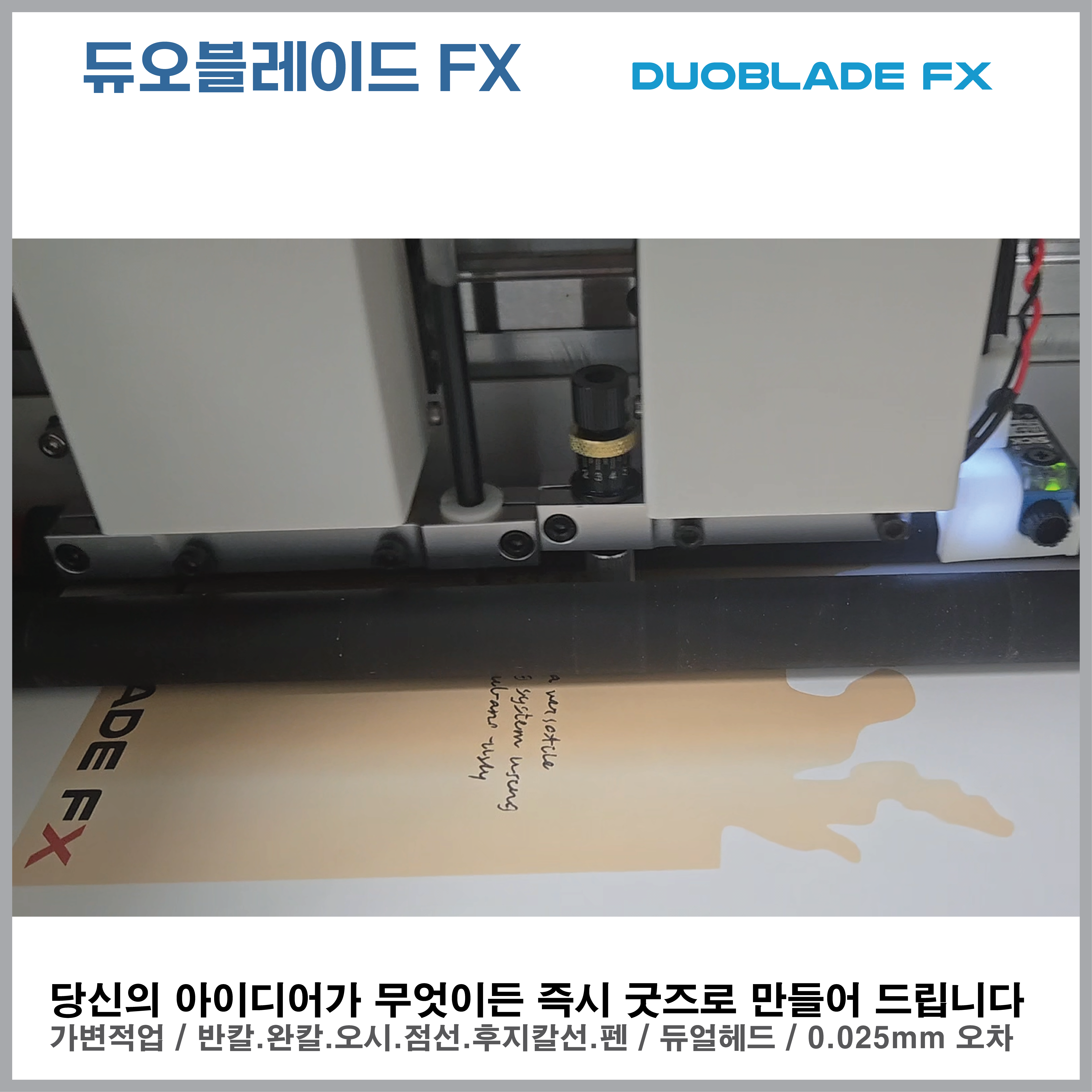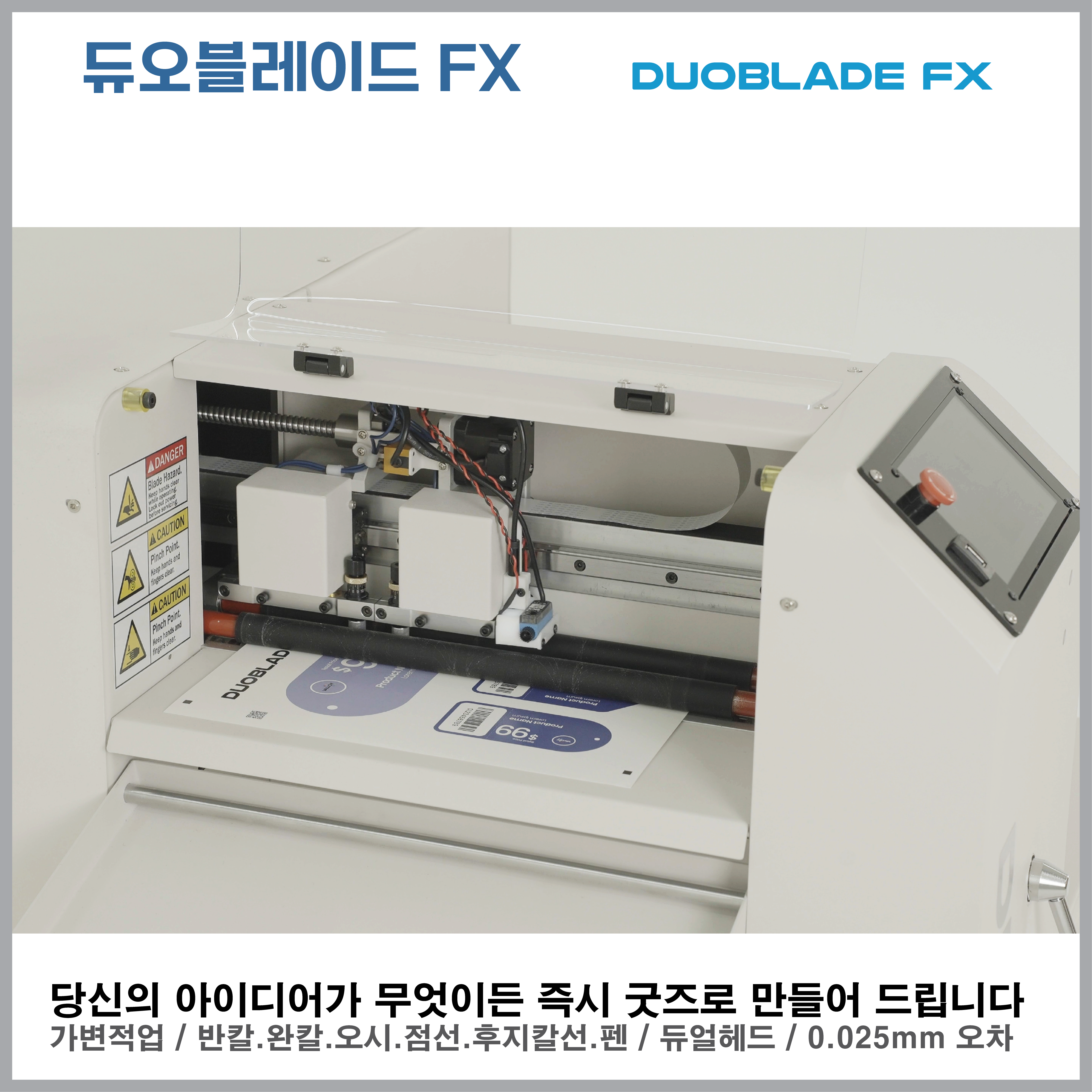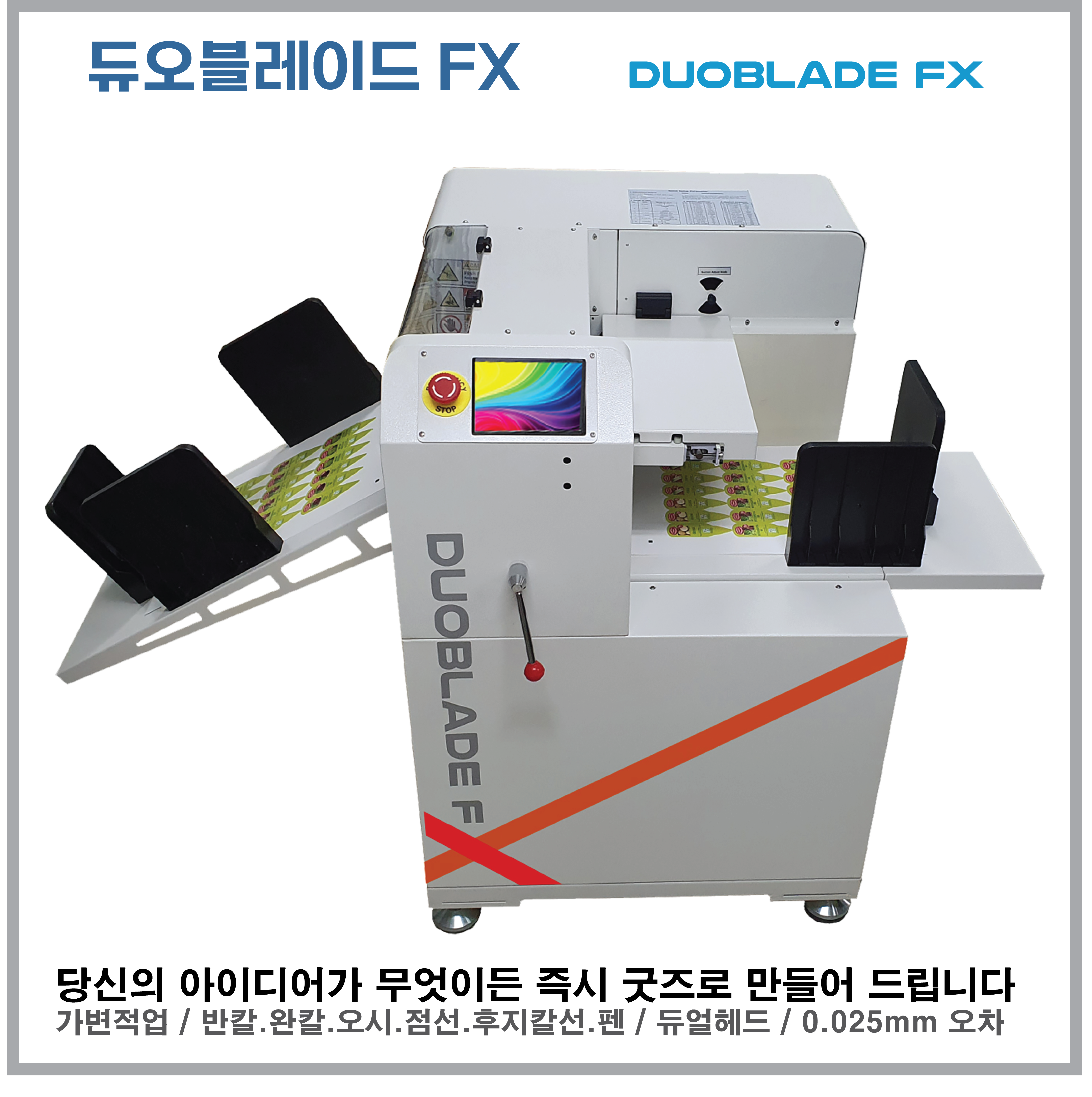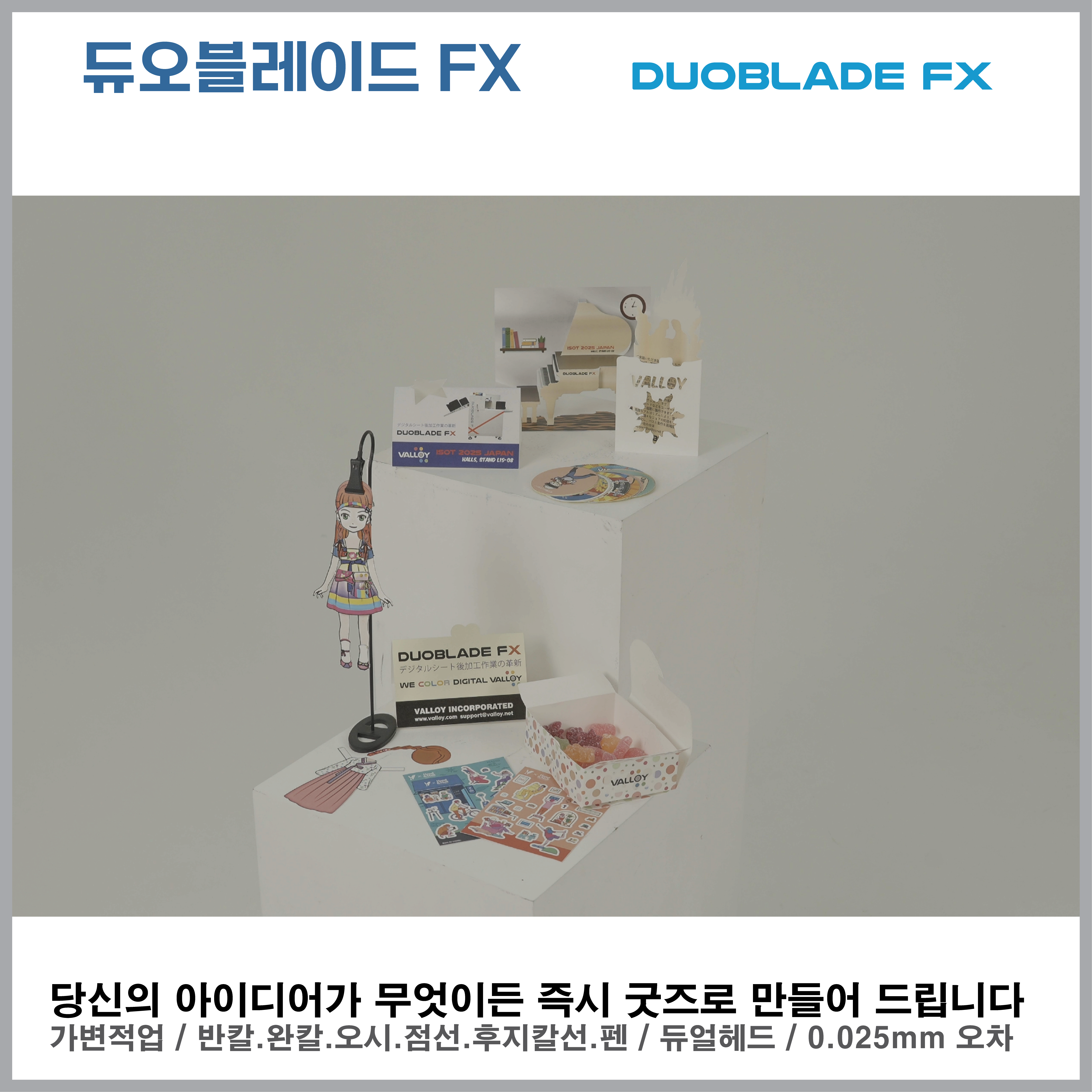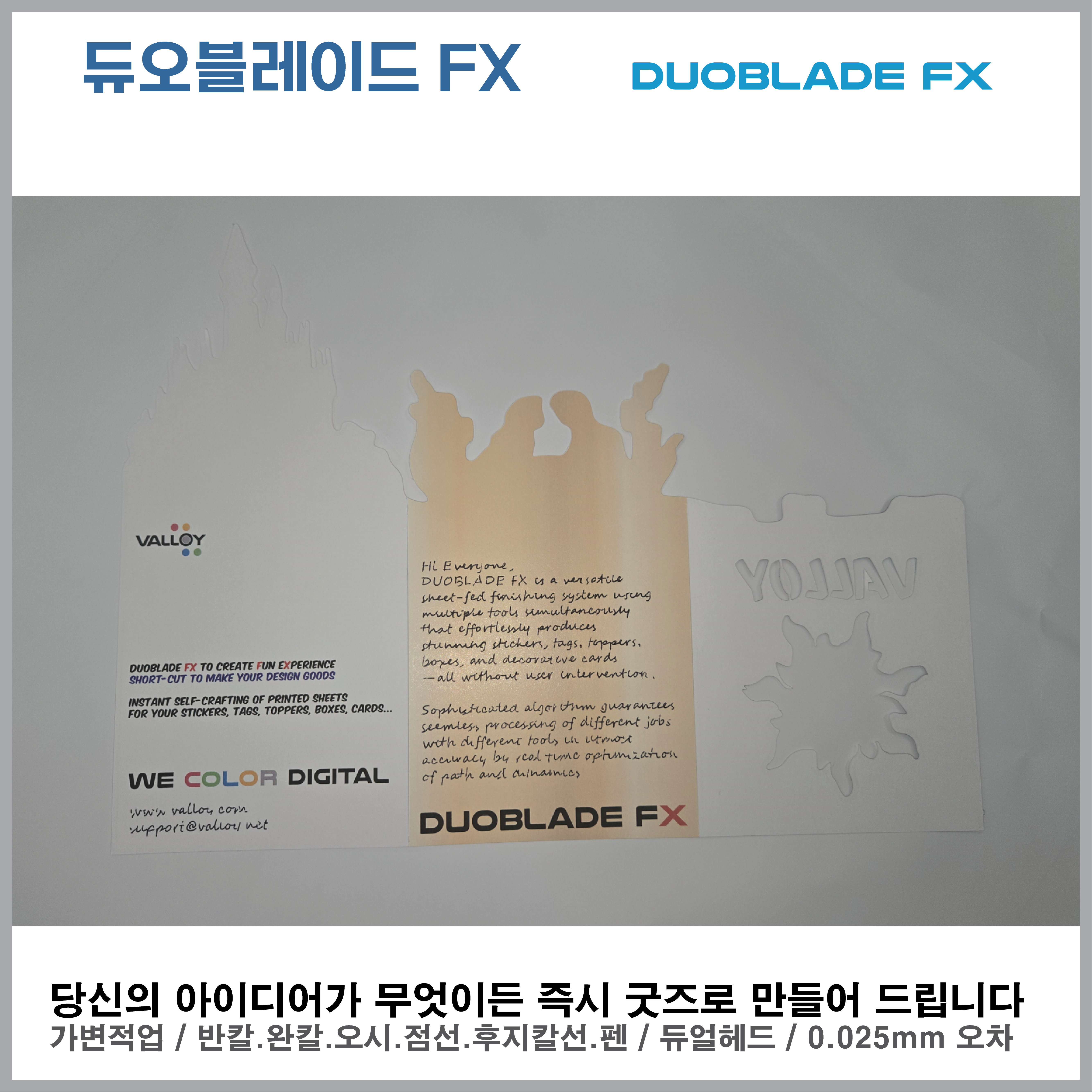 당신의 상상력은 현실이 됩니다. 다이어리, 케리어, 노트북 스티커, 복잡하고 아름다운 카드나 태그, 오시선과 절취선이 있는 박스, 케이크나 여행용 토퍼는 물론 세밀한 네일 스티커까지… 중소기업 혁신기술로 인정받고 서울어워드를 수상한 듀오블레이드 FX, 당신의 굿즈 생산에 날개를 달아 드립니다.